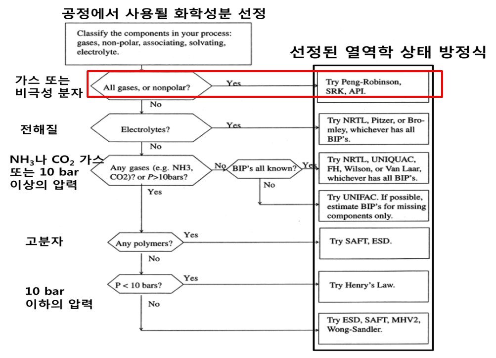 그렇다면, 어떤 조건에서 어떤 상태방정식을 선택해야 할까요? Peng-Robinson, SRK, NRTL 등 복잡한 열역학 상태방정식을 아래 표 1 기준에 따라 적용할 수 있도록 가이드라인을 참고해 주시기 바랍니다. 최근 석유의 대체 에너지로 우리에게 친근히 사용되고 있는 LNG(CH4)의 경우 가스의 범주에서 Peng-Robinson을 사용하여 대부분의 공정을 설계하고 해석할 수 있습니다.