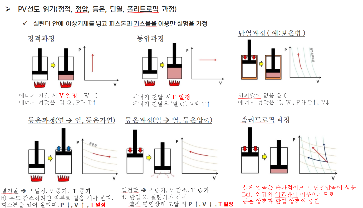 PV 선도를 통해 공정들의 다양한 움직임을 구분해 보았습니다. 다음시간에는 이러한 공정들의 제한된 조건 안에서, 이상기체를 가정하여 열과 에너지의 계산을 통해 내부에너지와 엔탈피를 구하는 방정식에 대해서 다뤄보도록 하겠습니다.