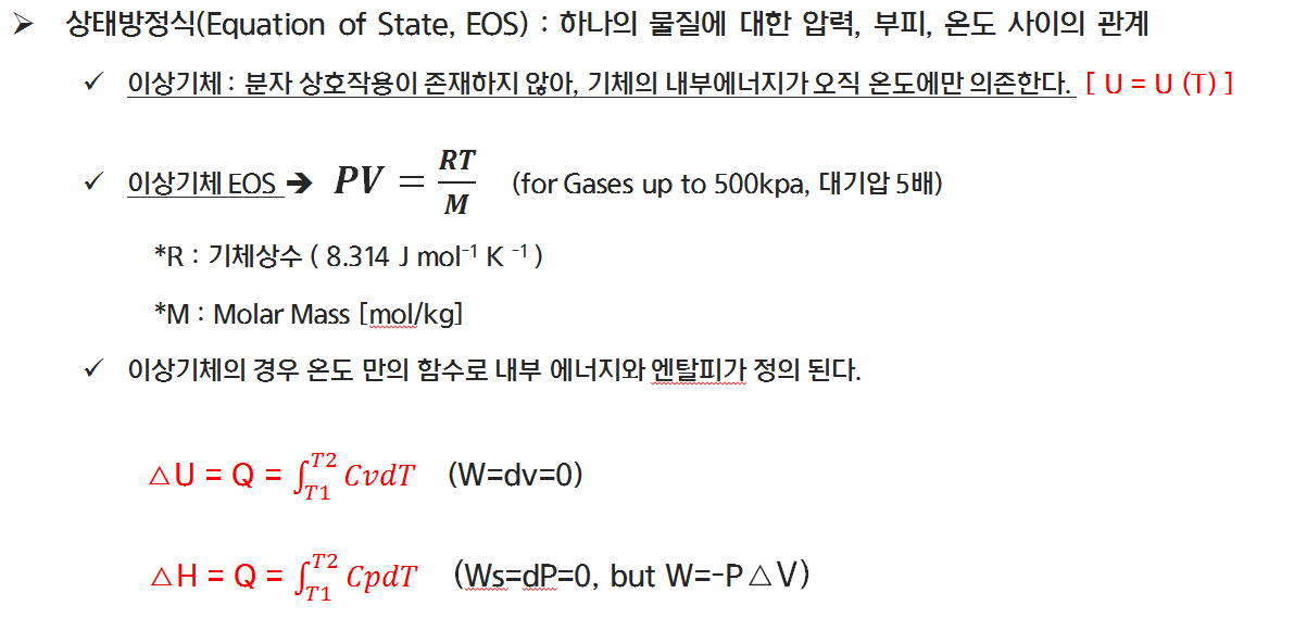 상태방정식은 하나의 물질에 대한 압력, 부피, 온도 사이의 관계를 나타내는 열역학적 지배방정식입니다. 우리가 이상기체라고 정의하는 (분자 상호작용이 존재하지 않는다. 등,) 기체는 PV=nRT의 관계를 보이며, 내부에너지와 엔탈피는 오직 온도에만 의존함을 수식으로 정리하여 나타냅니다.