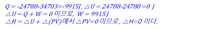 4. 또한, 내부에너지와 엔탈피 변화량(△U,△H)은 온도에 관한 함수(U(T), H(T))로, 초기 상태와 최종 상태의 온도가 같다면 내부에너지와 엔탈피 변화량(△U,△H)은 항상 0이다.
