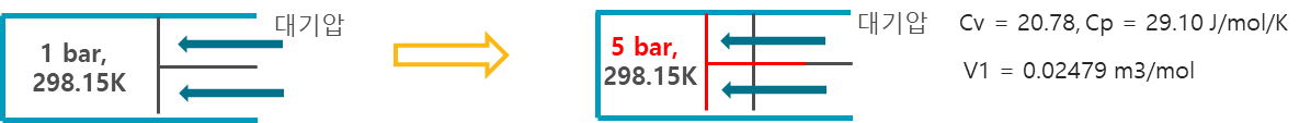 1 bar, 298.15 K (25℃)의 공기가 다음과 같은 두 가지의 서로 다른 역학적으로 가역적인 공정들에 의하여 5 bar, 298.15K로 압축된다.