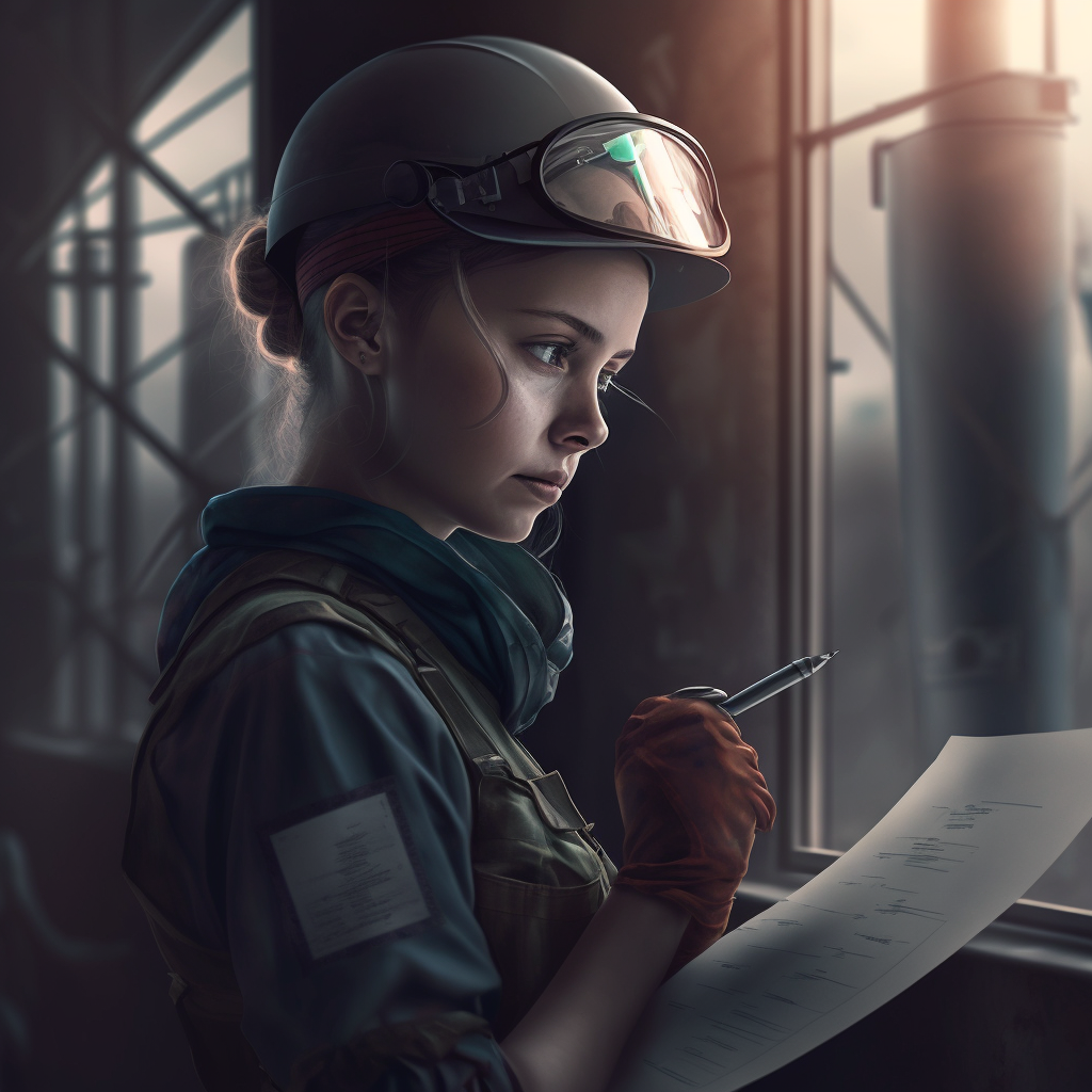 the girl who are drawing the chemical engineering drawing beside the window in the oil plant site. she looks like professional and young.
