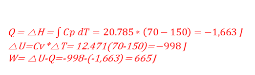△U=W=Cv △T=(12.471)(150-70) = 998 J