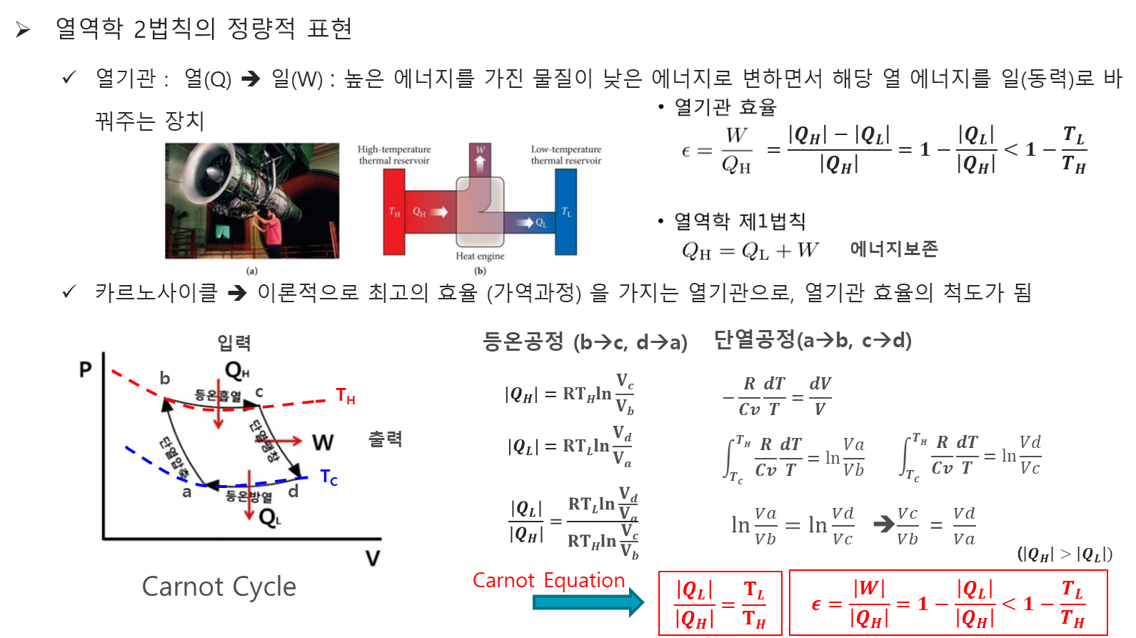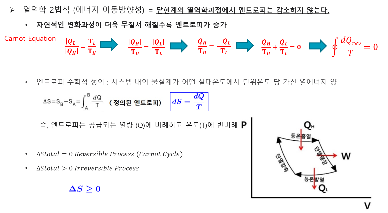 이렇게 정의된 Carnot Equation은 Cycle을 통해 들어오고 나간 열과 고온/저온 열저장고 온도 간의 일정한 상관관계를 나타내며, 이를 열역학적으로 엔트로피(S)라는 새로운 물성값으로 정의하였다는 것을 이해해야 합니다.