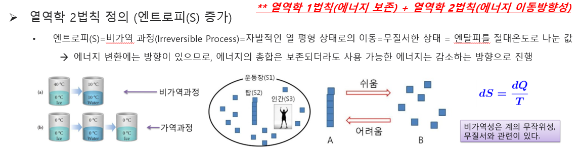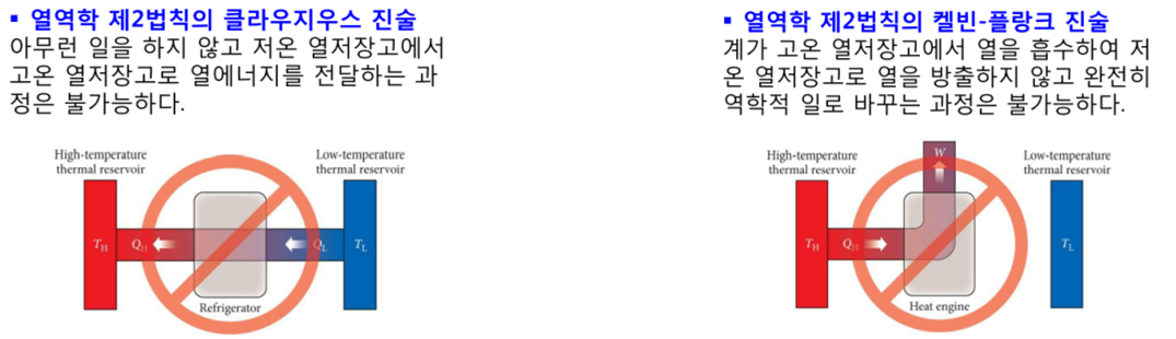 열역학 2법칙은 '엔트로피'라는 새로운 열역학 물성값을 정의하여 에너지 변환에는 방향이 있고, 총합이 보존되더라도 사용 가능한 에너지는 감소하는 방향으로 진행됨(엔트로피가 증가하는 방향)을 나타냅니다. 열역학 2법칙의 정의는 크게 아래의 두 가지로 설명할 수 있습니다.