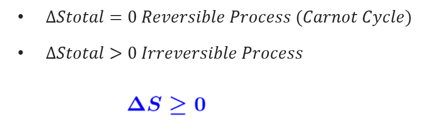 이러한 전체 엔트로피 변화는 실제 비가역 공정에서 항상 0보다 큰 값을 갖는 방향으로 에너지가 이동함.