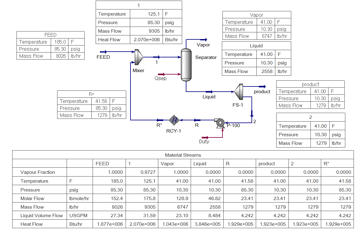 Feed와 R* Stream으로 들어가는 Mass의 총합은 152.4 lbmole/hr + 23.41 lbmole/hr = 175.8 lbmole/hr로 1번 Stream의 175.8 lbmole/hr 와 동일하게 전체 질량이 합쳐지는 것을 확인할 수 있습니다.
