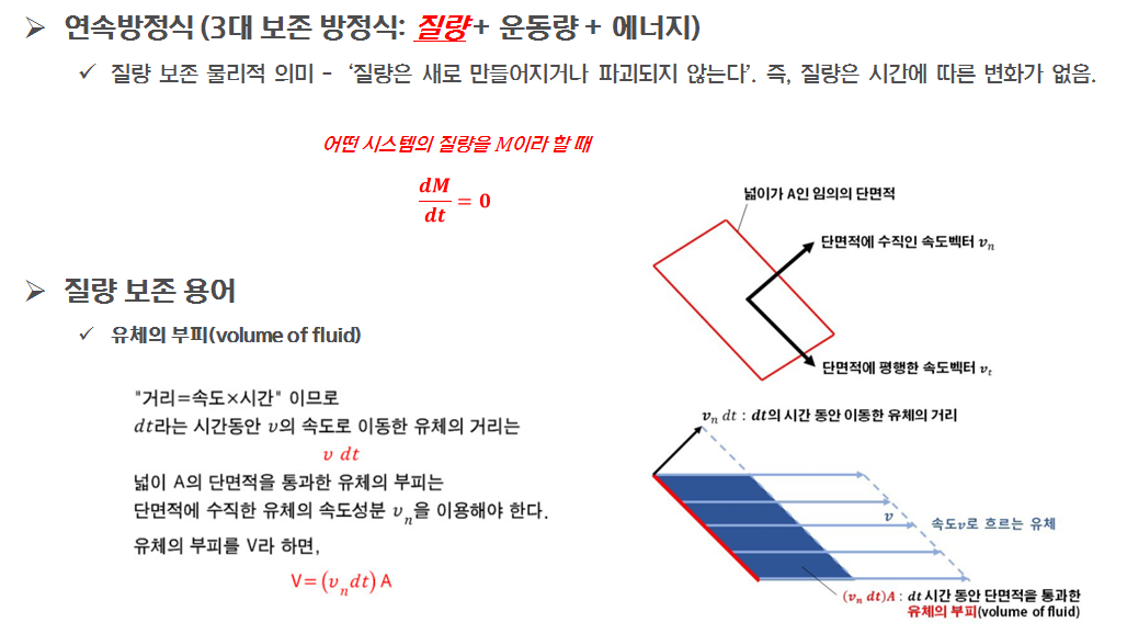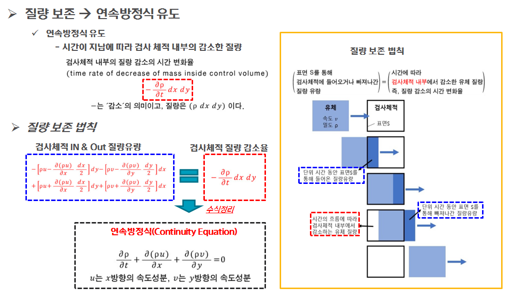 위에서 설명된 질량보존 용어에 근거하면 연속방정식의 한 모델인 질량보존방정식을 수학적으로 유도할 수 있습니다. 그럼 다음 슬라이드를 함께 보면서 질량보존방적식을 유도해 보도록 하겠습니다.