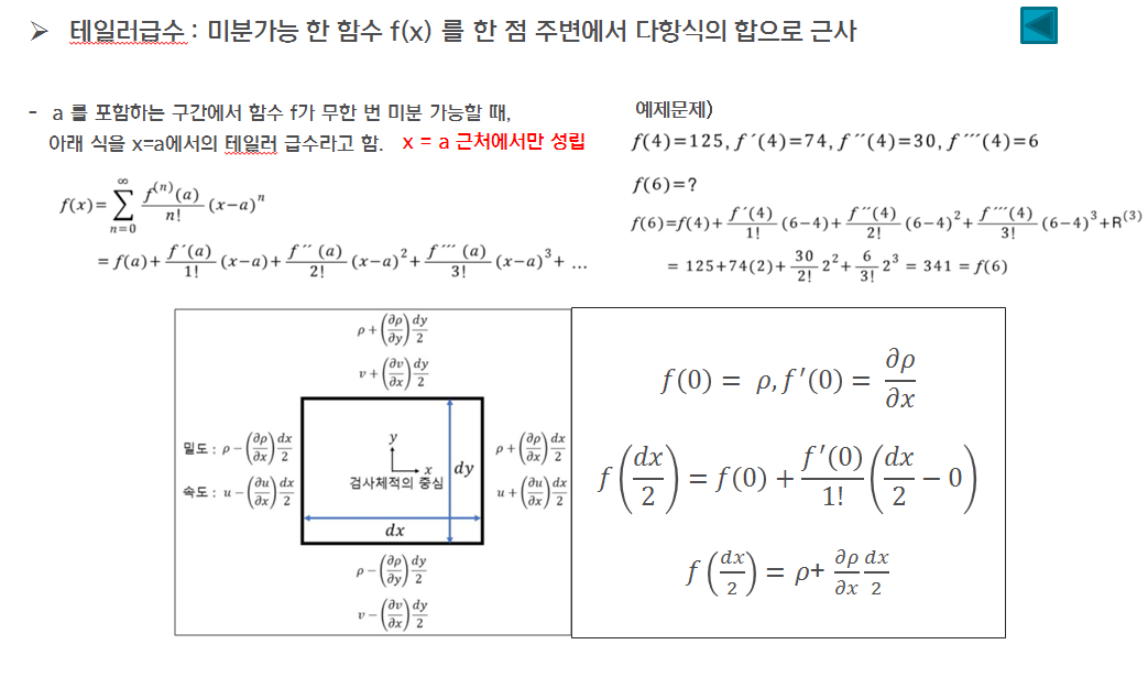 - 2. 먼저, 푸른색 점선의 입/출력 질량을 테일러급수 전개를 통해 1차 근사하여 표현하면, 위와 같이 수식을 정리할 수 있습니다. 테일러급수란 제일 아래 첨부 1. 슬라이드를 참조부탁드립니다. 간략한 설명은, 검사 체적 중심의 유체속도(u)와 밀도(ρ)에 대하여 각 벡터 방향 입/출력 위치에서의 유체 속도(u+ ∂u/∂x dx/2)와 밀도(ρ+ ∂ρ/∂x dx/2) 값을 선형 근사하여 표현할 수 있음을 말합니다.