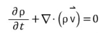 - 4. 위 연속 방정식 전개를 위한 검사체적은 실제로 3차원 공간이므로, x, y 방향의 속도성분 u, v에 z 방향의 속도성분 w를 더해주면 아래와 같이 최종 벡터형식의 방정식이 성립되고, 여기서, ∇(델)은 3차원 모든 방향에 대해 속도성분을 미분하여 전개함을 의미합니다. 또한, 만일 검사체적을 지나는 유체가 비압축성 유체인 액체의 경우 밀도의 변화가 거의 없음으로 밀도 항을 무시할 수 있습니다.